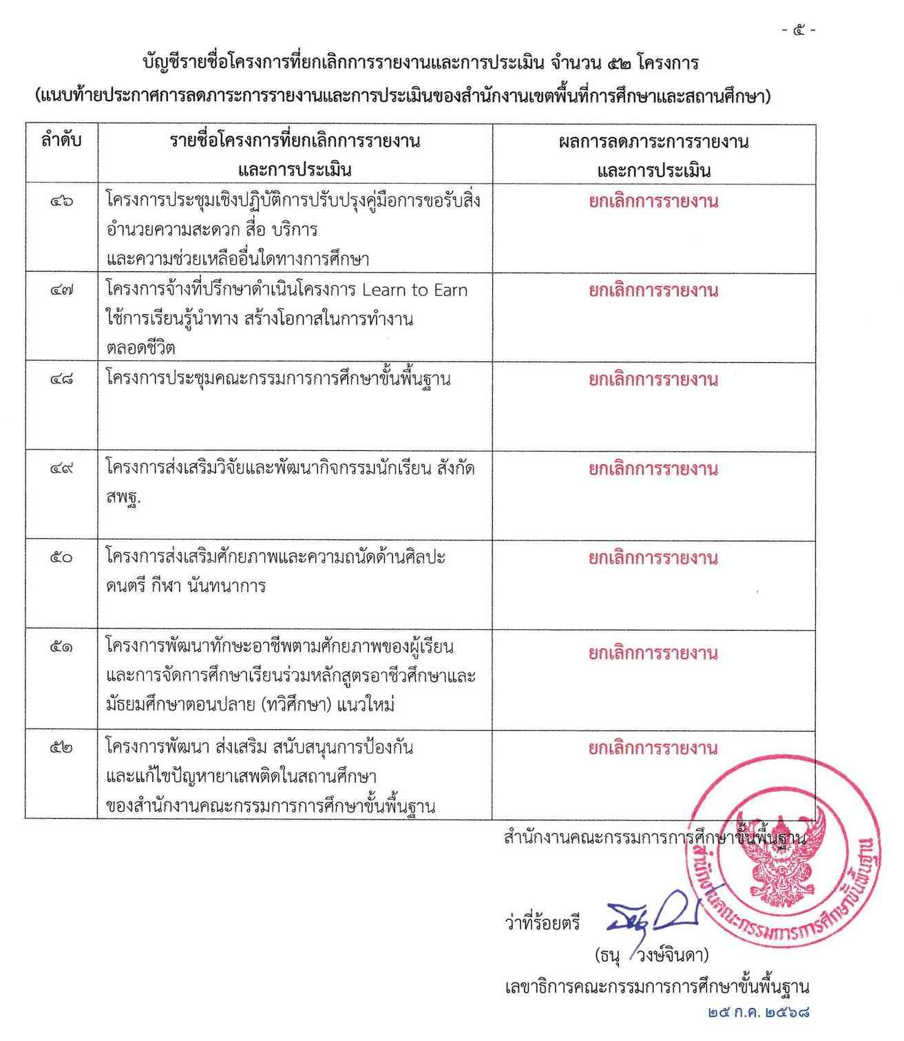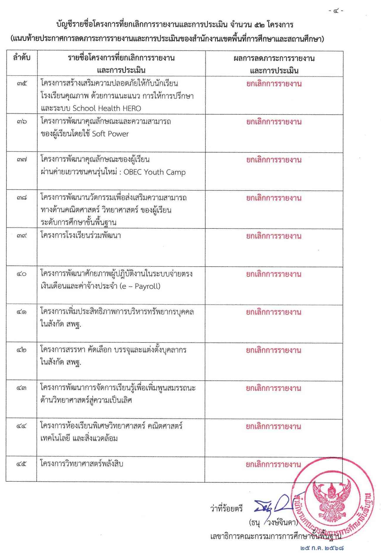 ยกเลิกการรายงาน 52 โครงการ ตามนโยบายลดภาระงานครู เพื่อให้ครูและบุคลากรทางการศึกษาได้มุ่งเน้นการจัดการเรียนการสอนและพัฒนาผู้เรียนได้เต็มศักยภาพ และมีประสิทธิภาพ สอดคล้อง สพฐ. นโยบายเรื่อง ลดภาระการประเมินของสถานศึกษาและปรับลดภาระงานที่ไม่จำเป็นหรือซ้ำซ้อน ประกาศเมื่อ 25 กรกฎาคม 2568